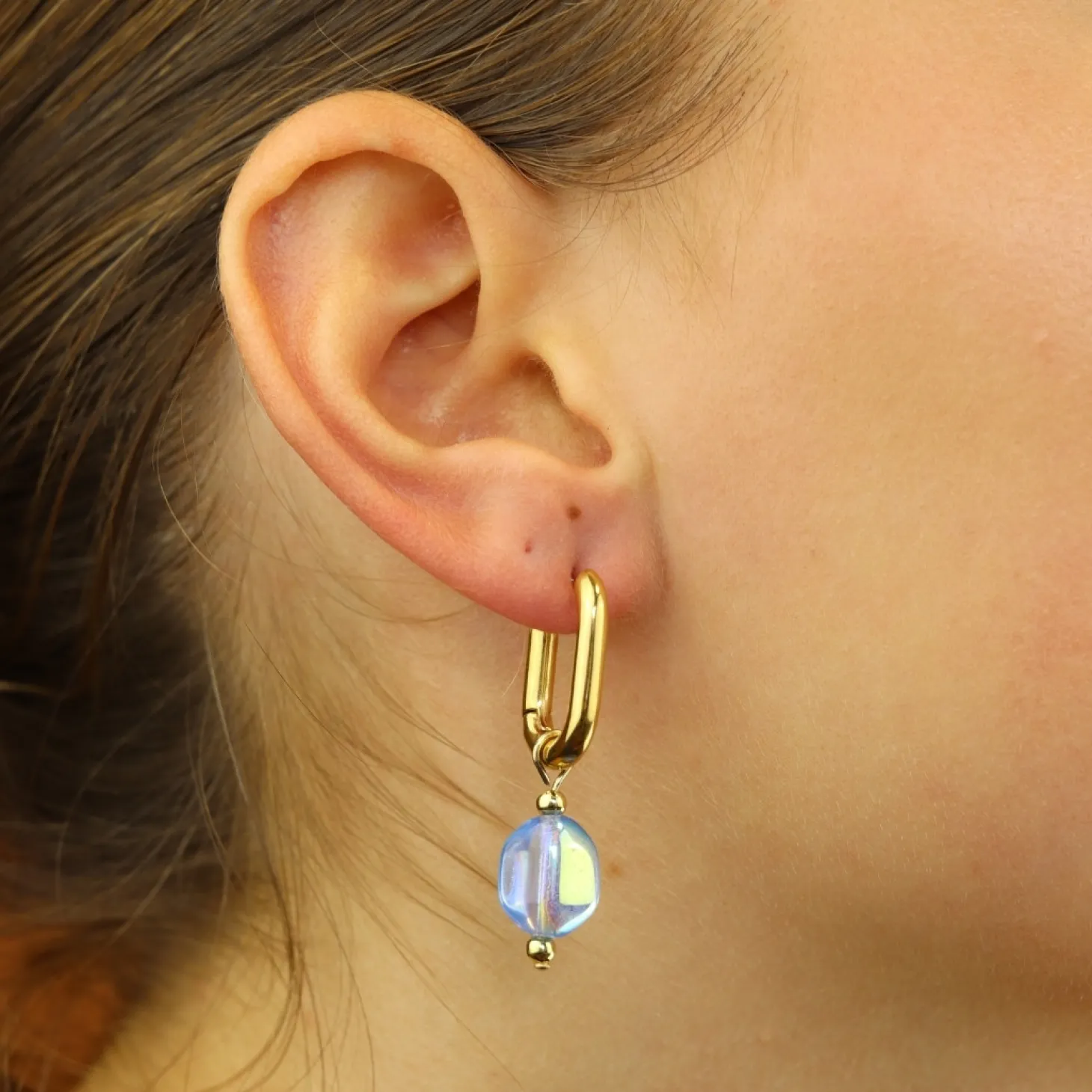 Deze oorringen hebben een prachtige lichtblauwe glaskraal en een gouden sluiting. Ze zijn perfect voor iedere gelegenheid. Of je nu een casual look wilt creëren of je outfit wilt opleuken voor een speciale gelegenheid, deze oorhangers zijn de perfecte accessoire! De oorringen zijn gemaakt van stainless steel, dus zijn waterproof en verkleuren niet!