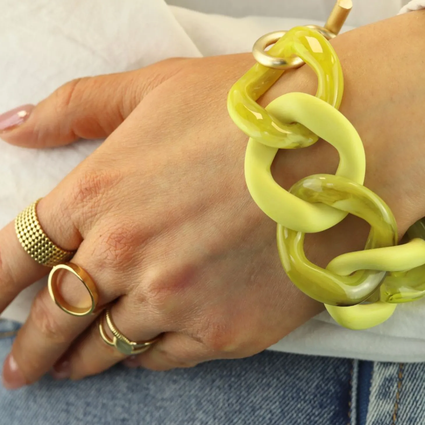 Deze gemarmerde armband in lime kleur is gemaakt van kunststof, waardoor hij lekker licht is om te dragen. Én je kunt er eindeloos mee combineren. Draag hem enkel, of stapel je schakelarmband!