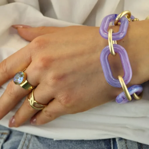 Deze armband is je perfecte metgezel voor het voorjaar! De stijlvolle combinatie van grote ovalen schakels in de zomerse kleur Blueberry Swirl en de gouden accenten maakt hem een echte eyecatcher. Met zijn lichte draagcomfort voel je bijna niet dat je hem draagt. Combineer de schakelarmband met andere items uit de zomercollectie voor een complete look.