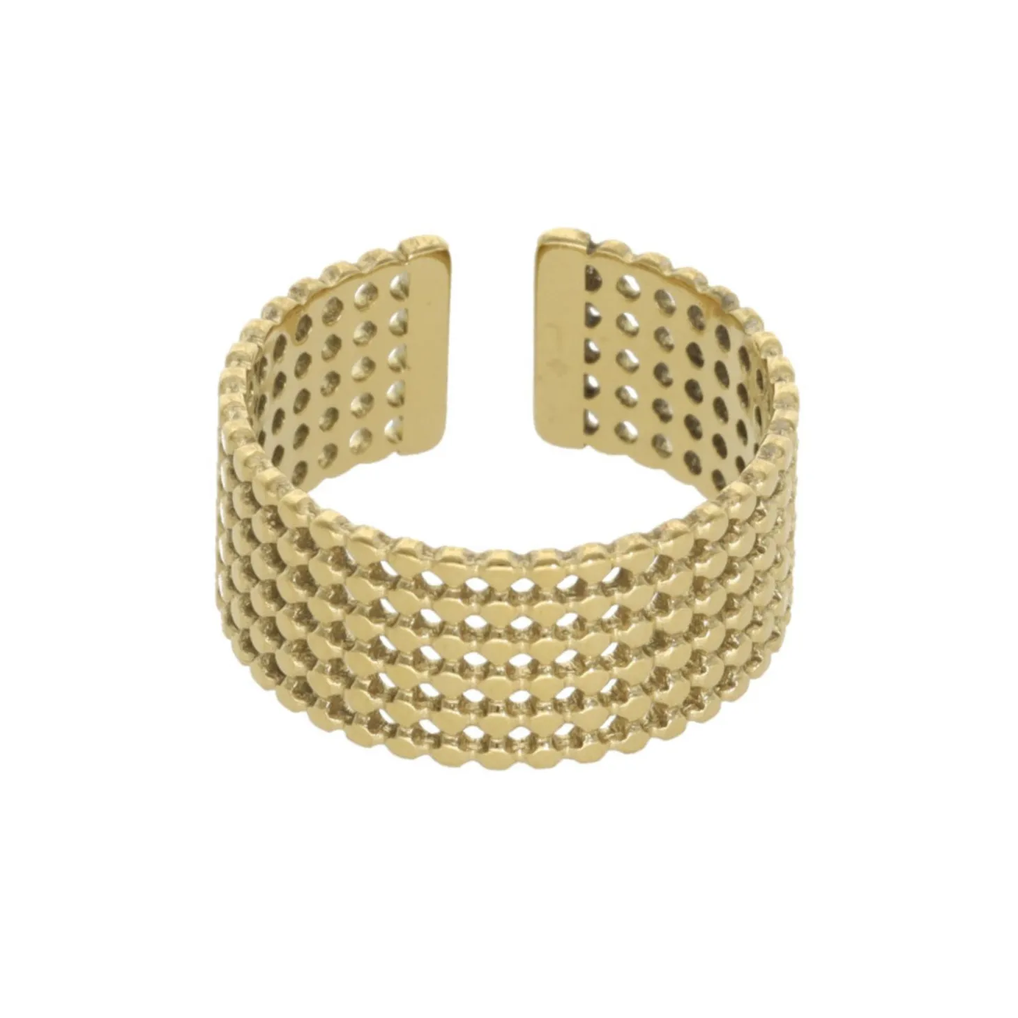 Deze prachtige Golden Mesh Ring ring kun je eindeloos combineren! Combineer de ring met een van onze andere ringen. Zo creëer je een super gevarieerde ring party. De ring is verstelbaar en past van maat 16,5 t/m 18,5 en is gemaakt van stainless steel, dus is waterproof en verkleurt niet!