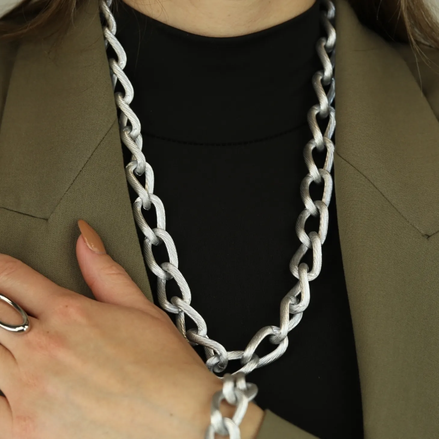 Camps & Camps gebruikt dit lichte en anti-allergische metaal in subtiele ton-sur-tontinten voor grove en fijnere schakels. Prachtig om te zien en heerlijk om te dragen.